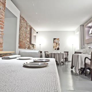 Il percorso si destreggia con abilità, sicurezza e apparente facilità tra tradizione (vitello tonnato), mare (capesante, legumi primaverili, terra fondente, parmigiano e caffè), creatività (cappuccino di patate di montagna, foie gras, vongole, lemon grass e spinacio), tributo al maestro Marchesi (risotto alla milanese con foglia d’oro), classicismo yankeezzato (suprema di piccione in salsa bbq, mais, burro d'arachidi ed erbe selvatiche) e la sublime leggerezza di un sorbetto all’anguria. Tra gli ormai inevitabili amuse-bouche che vedono i cuochi a rivaleggiare per numero e inventiva, merita la segnalazione il lolli pop al brasato, la variazione sul bagnetto verde e un sublime crostino con la locale nocciola di Langa a dominare, regina incostrata.